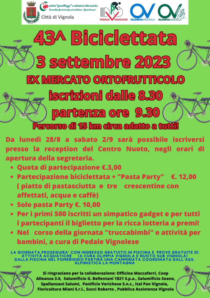 La 43^ edizione della tradizionale biciclettata avrà luogo domenica 3 settembre, con partenza e arrivo al Vecchio Mercato Ortofrutticolo. Il percorso, che si snoderà tra le strade del nostro Comune, attraversando le “Basse”, per giungere [...]